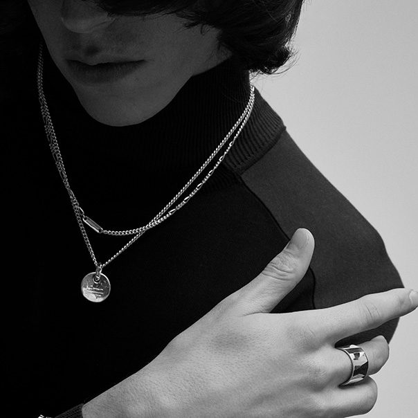 少し繊細なネックレスを重ねると色気が増す。手で削り出したペンダントトップの揺らぎある表情。3種のチェーンを組み合わせたネックレスを合わせてニュアンスに変化をつける。 あるいは少し細身のリングとチェーンのディテールで遊ぶ。